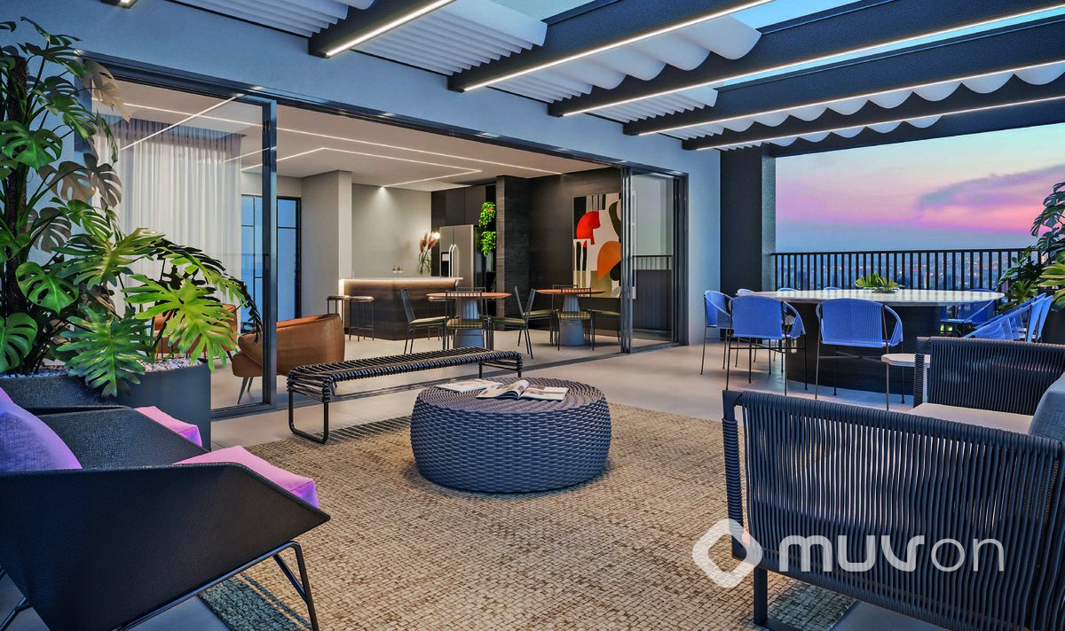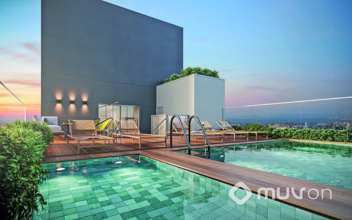 Área de lazer completa completa com piscina no rooftop.