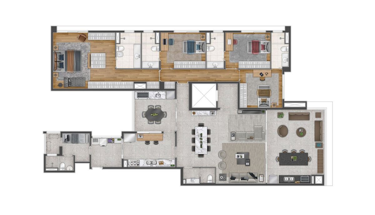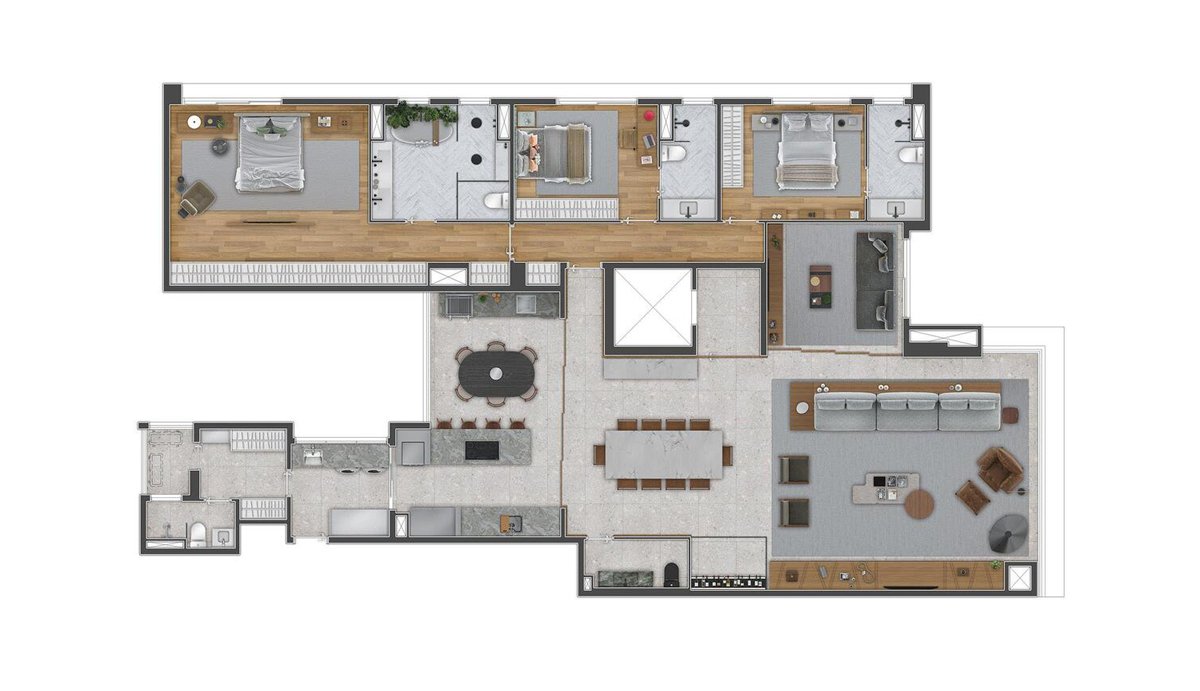 100% residencial sendo torre única com apartamentos de 234m² com opção de 3 ou 4 suítes e com 4 vagas.