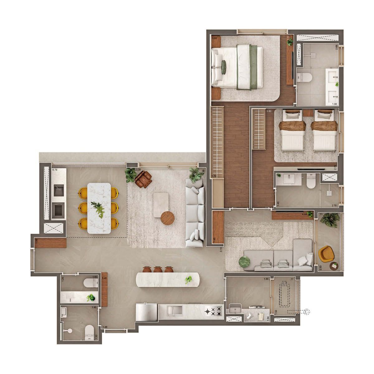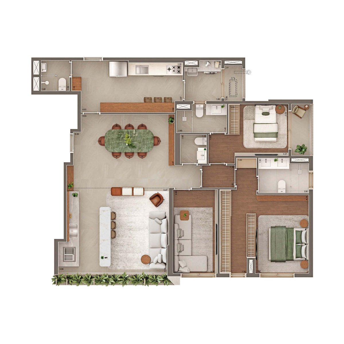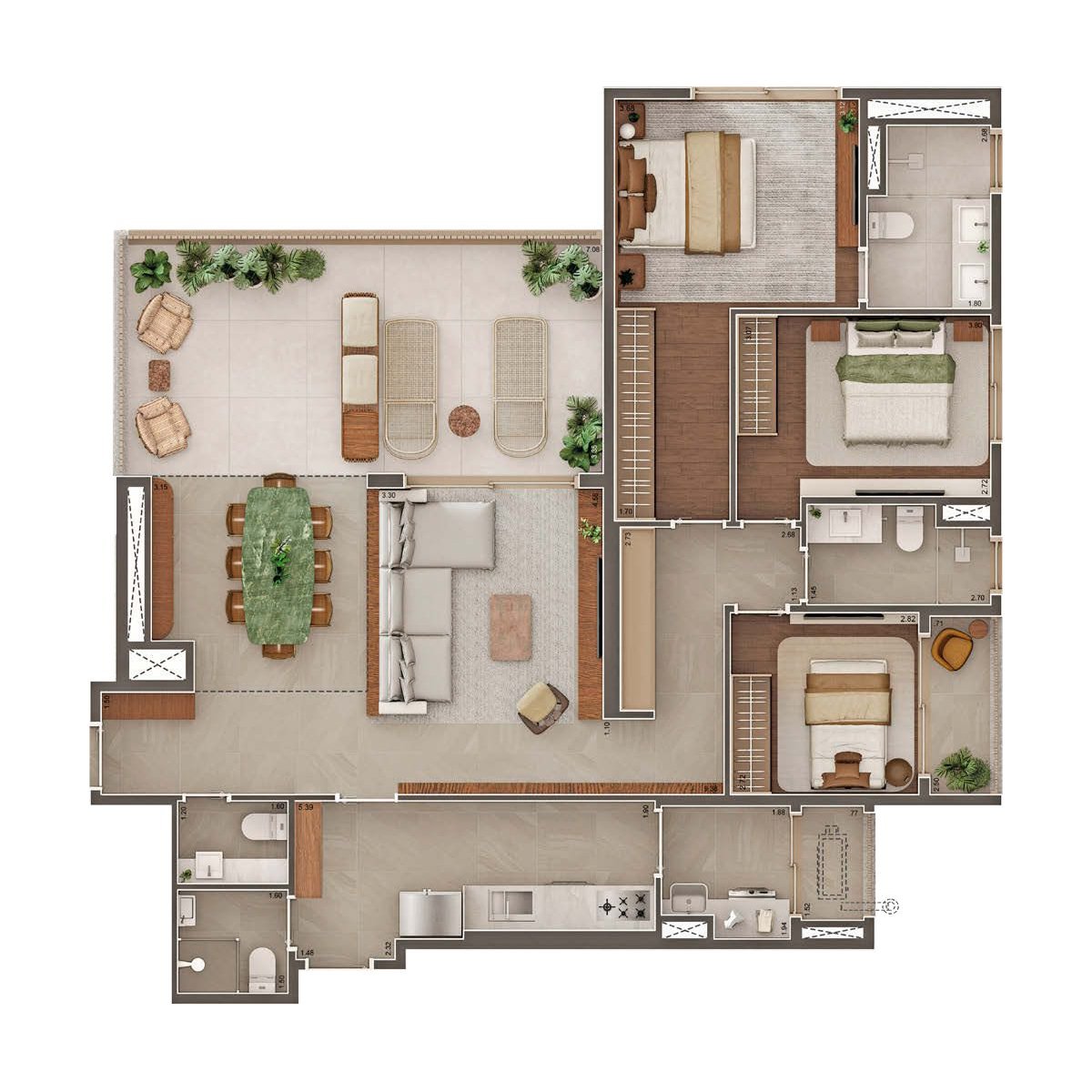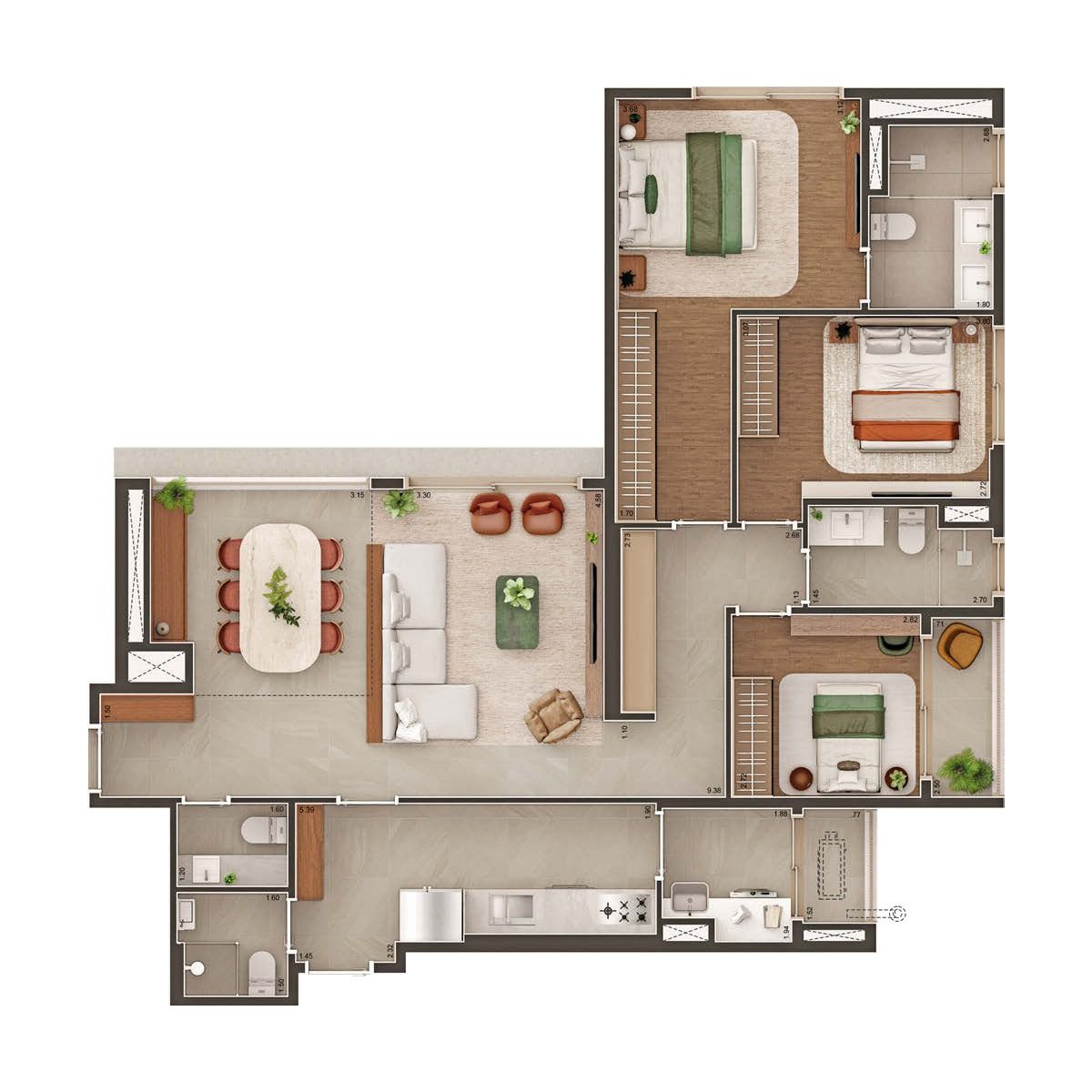 Apartamentos de 124m² e 150m² com 3 dormitórios ou 3 suítes.