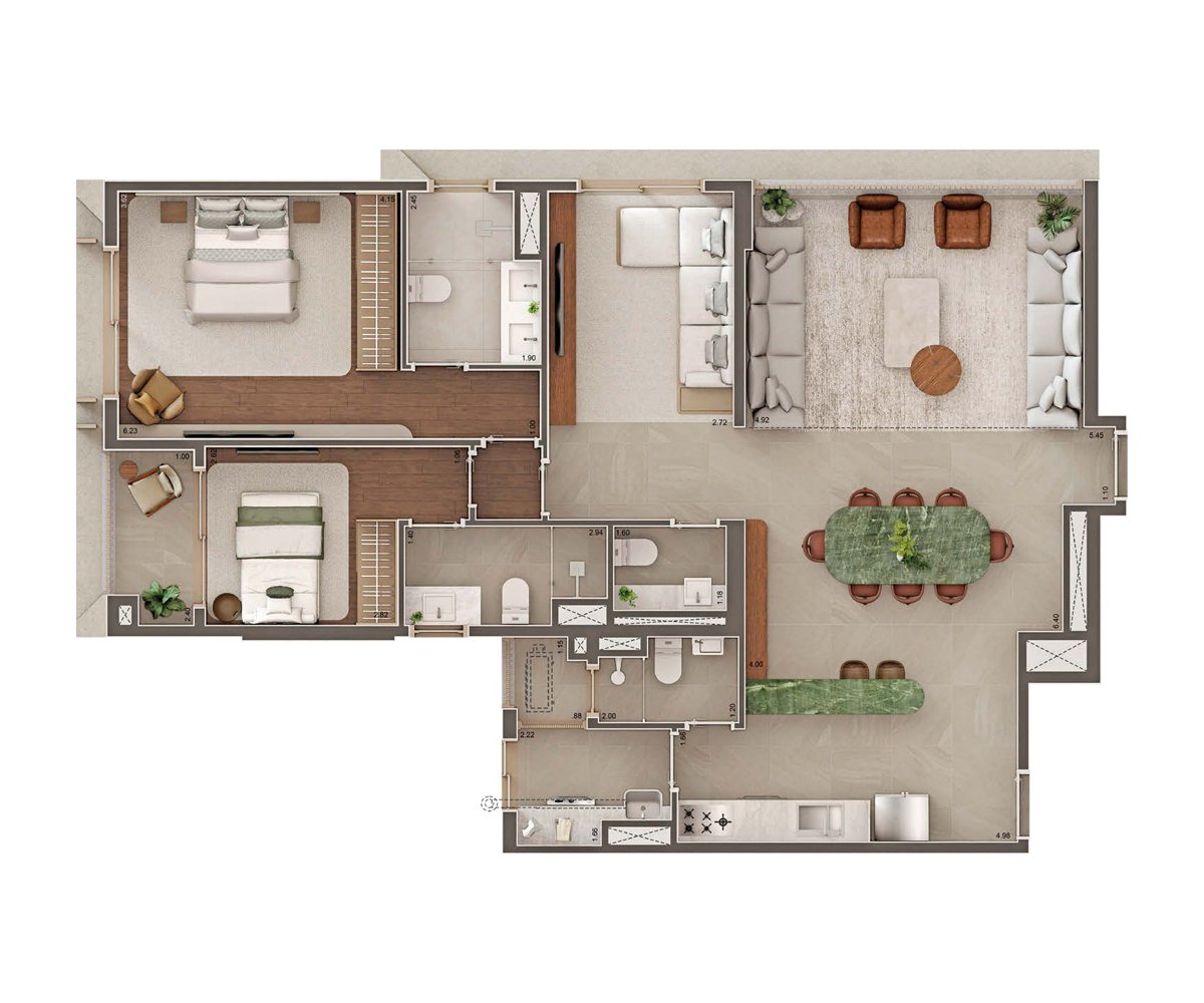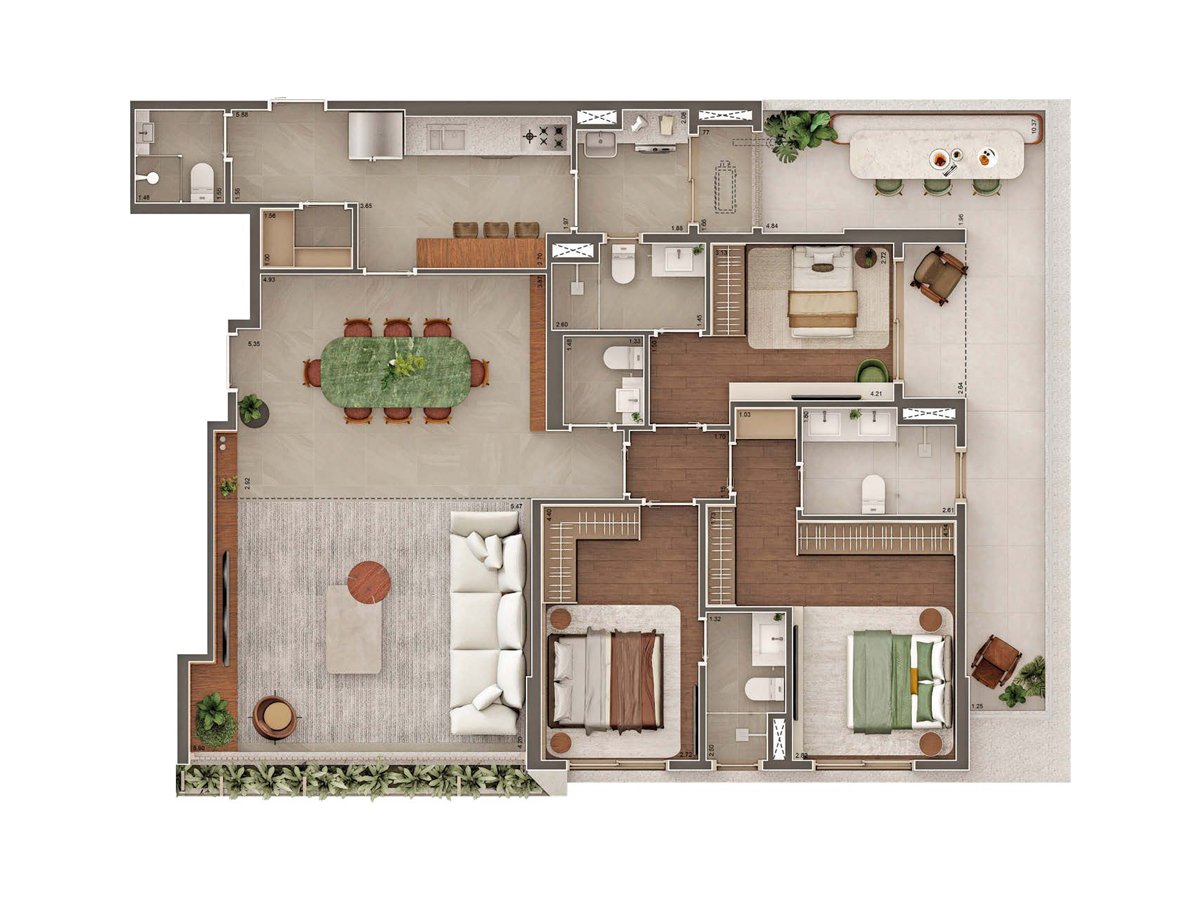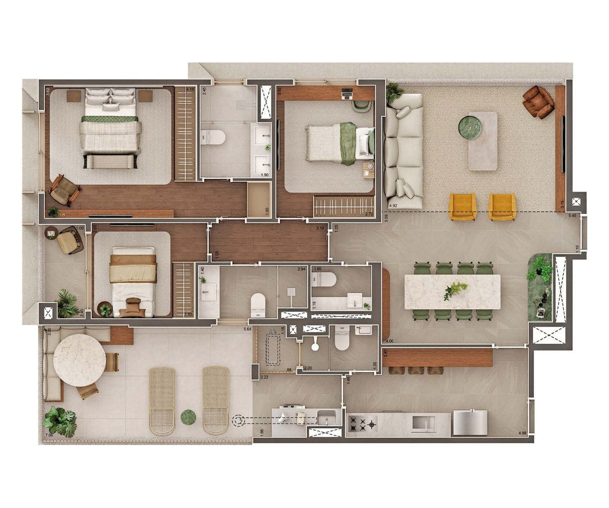 Apartamentos de 124m² e 150m² com 3 dormitórios ou 3 suítes.