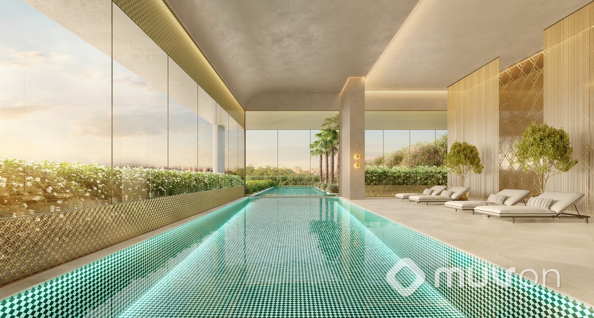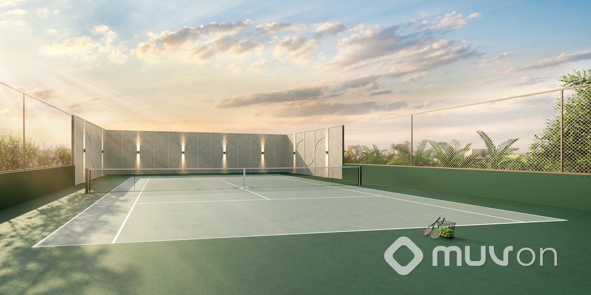 Área de lazer completa incluindo piscina coberta, sauna e quadra de tênis.