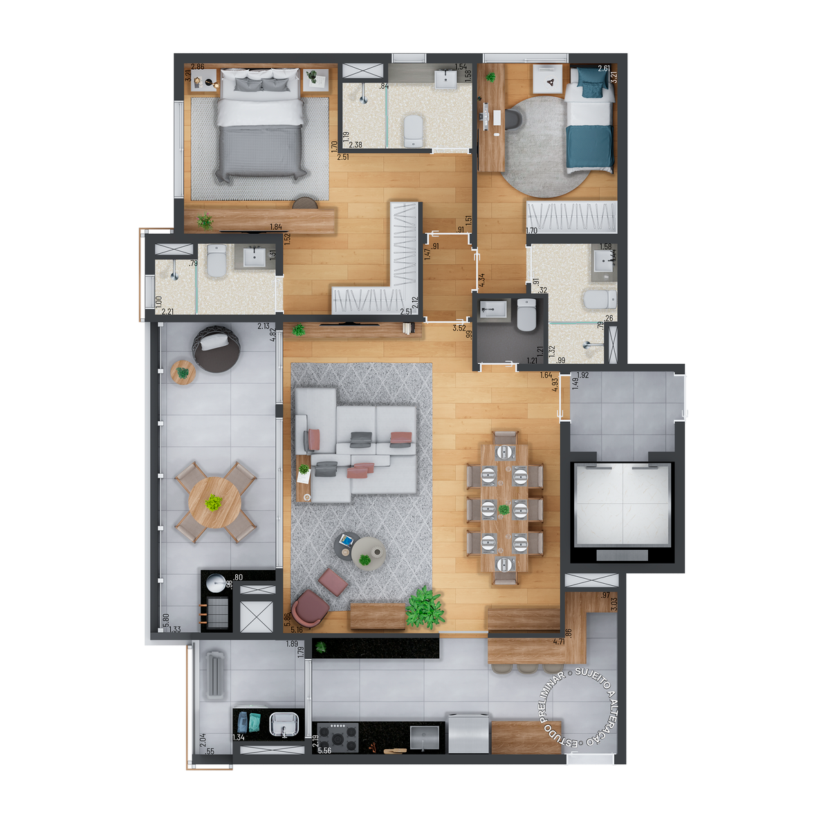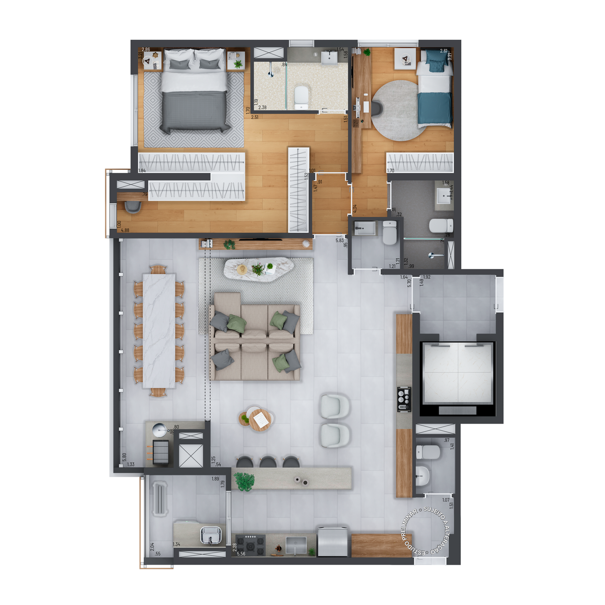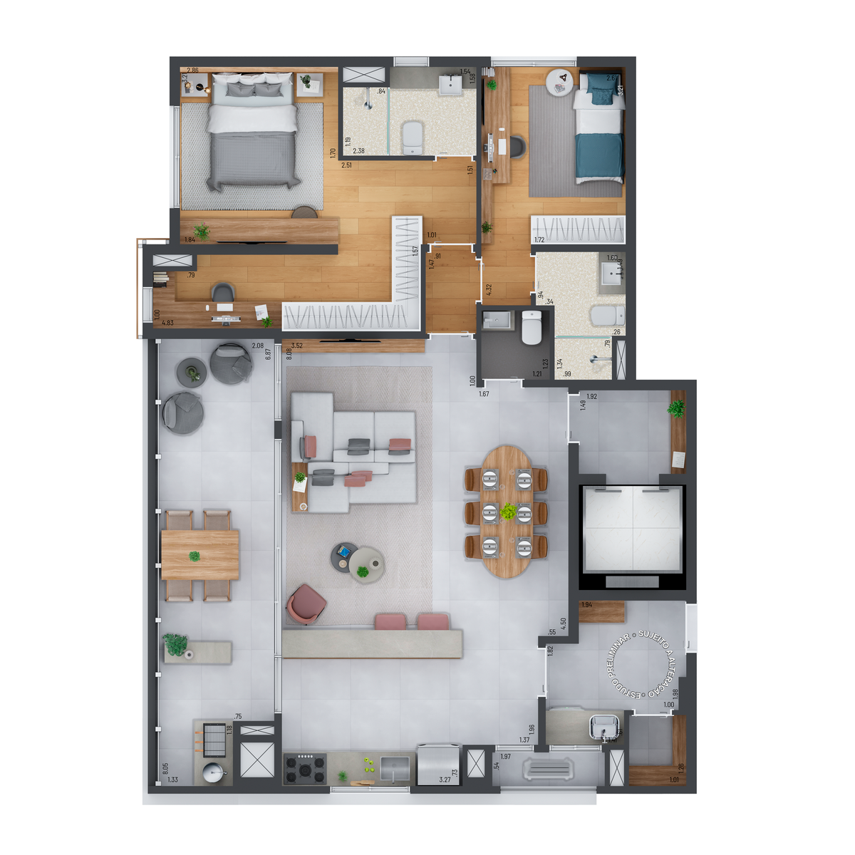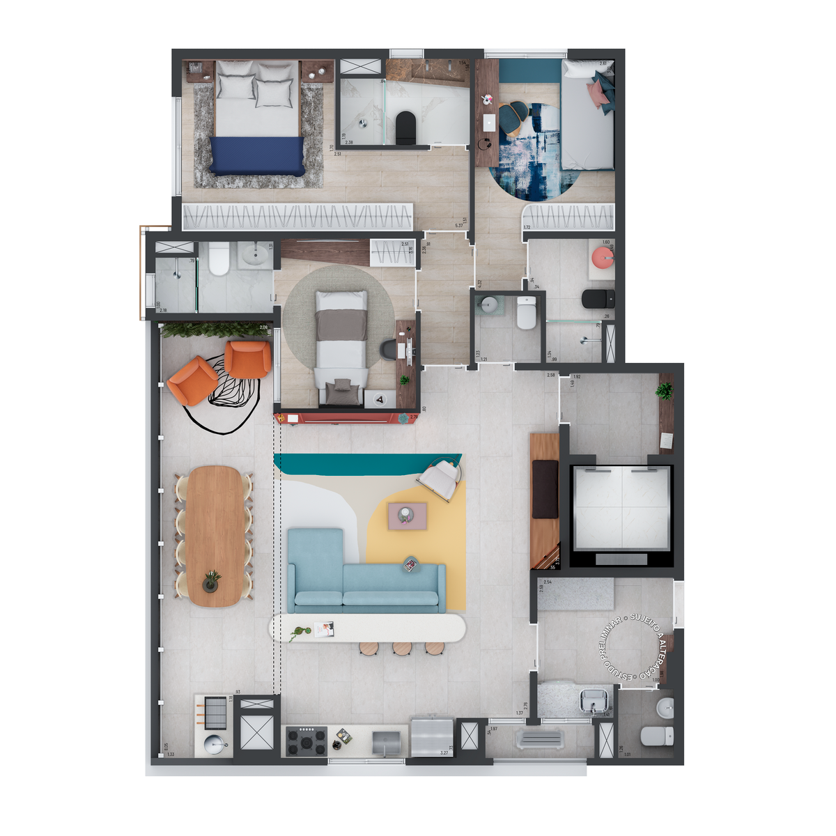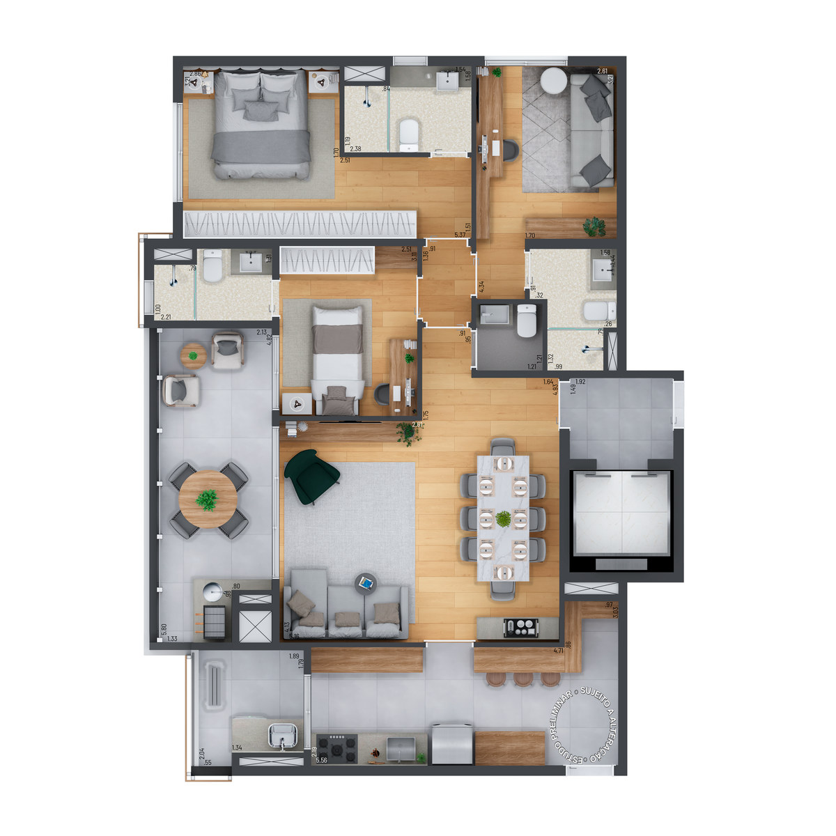 Os apartamentos tem as seguintes opçoes de dormitórios: 3.